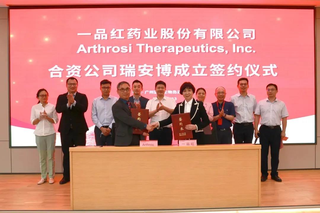 近日,一品红药业股份有限公司(以下简称“一品红”,证券代码:300723)与全球创新药研发公司Arthrosi Therapeutics(以下简称“Arthrosi”)在广州国际生物岛举行合资公司签约仪式,宣布双方共建的合资公司——广州瑞安博医药科技有限公司(暂定)正式成立。一品红董事长李捍雄,Arthrosi 联合创始人Shunqi Yan (颜顺启)博士及双方代表共计一百余人出席仪式。